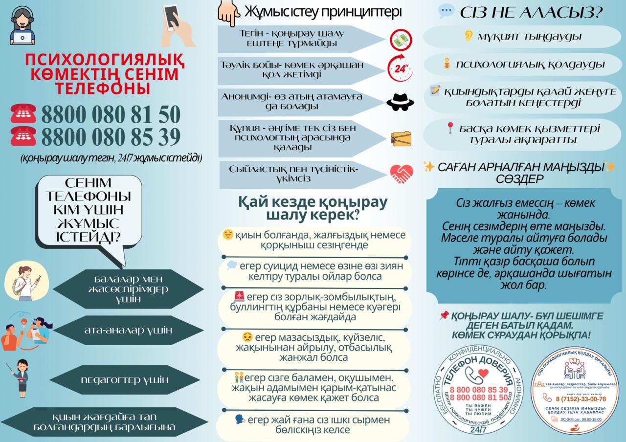 Біздің облыста Психологиялық қолдау орталығында тегін, анонимді және тәулік бойы психологиялық көмек алуға болатын сенім телефоны жұмыс істейтінін еске салғымыз келеді.