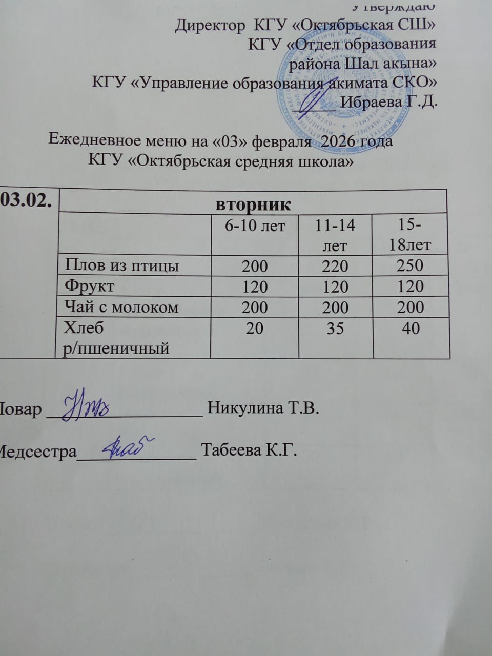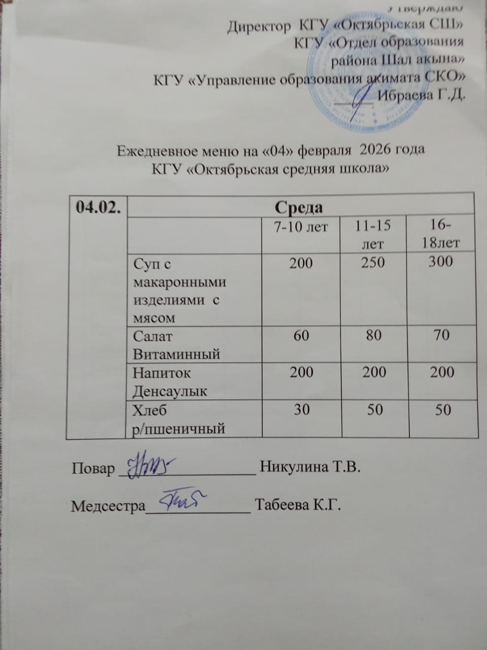 Ежедневно медицинским работником или ответственным лицом проводится органолептическая оценка качества готовых блюд с внесением записей в журнал органолептической оценки качества блюд и кулинарных изделий.